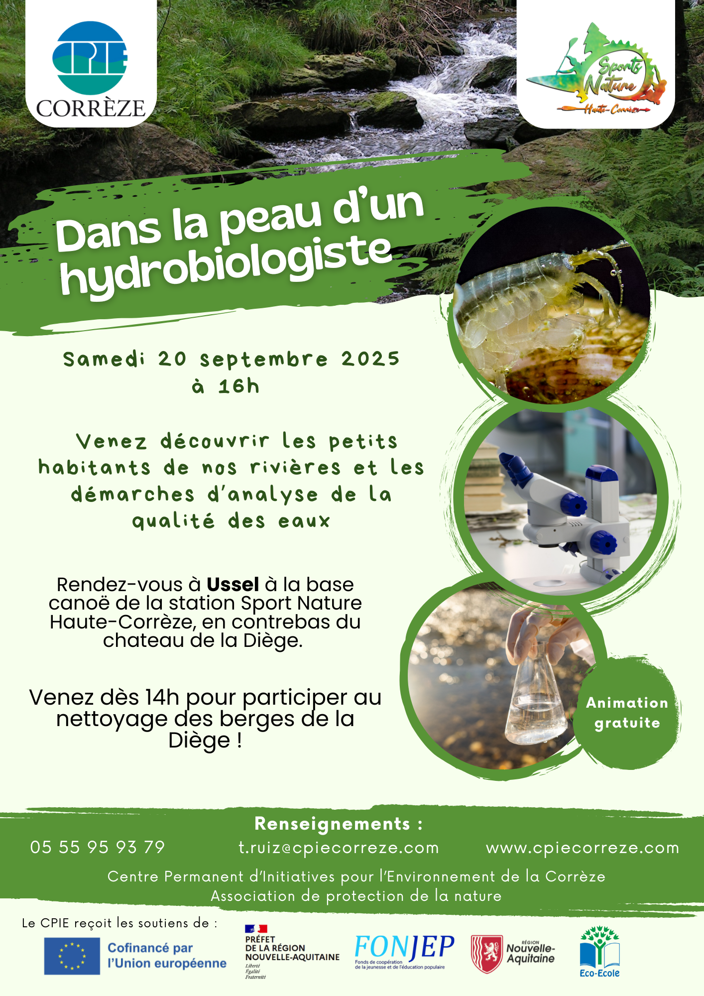 Au niveau de la base kayak de la station sport nature de haute corrèze en contrebas du chateau. Pensez à venir participer à l’action de nettoyage qui précède l’animation et ensuite vous pourrez découvrir les petites bêtes qui vivent dans l’eau ainsi que les méthodes d’analyse de la qualité de l’eau !